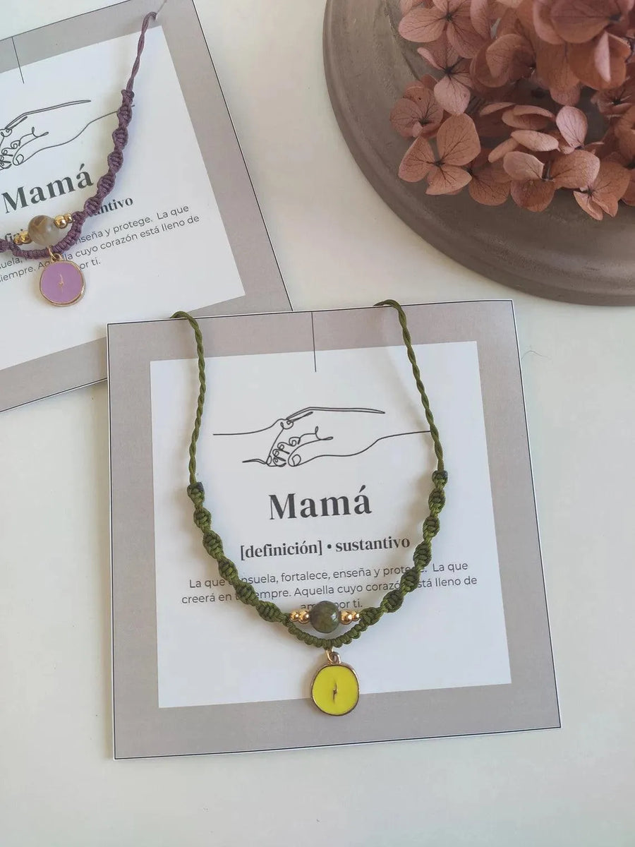 Add a touch of sophistication and bold style to your look with our "Love Mom" nylon and stainless steel bead necklace.